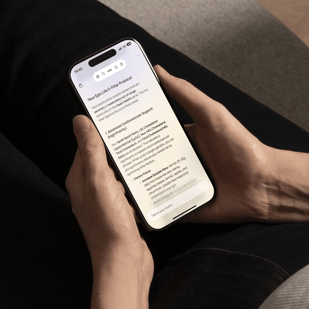 3. Your personal expert team: It’s like having a nutritionist, PT and mindset coach in your pocket. Ask for anything, from "gut-friendly recipes" to "marathon training plans”, and get a protocol built for your specific bloodwork.